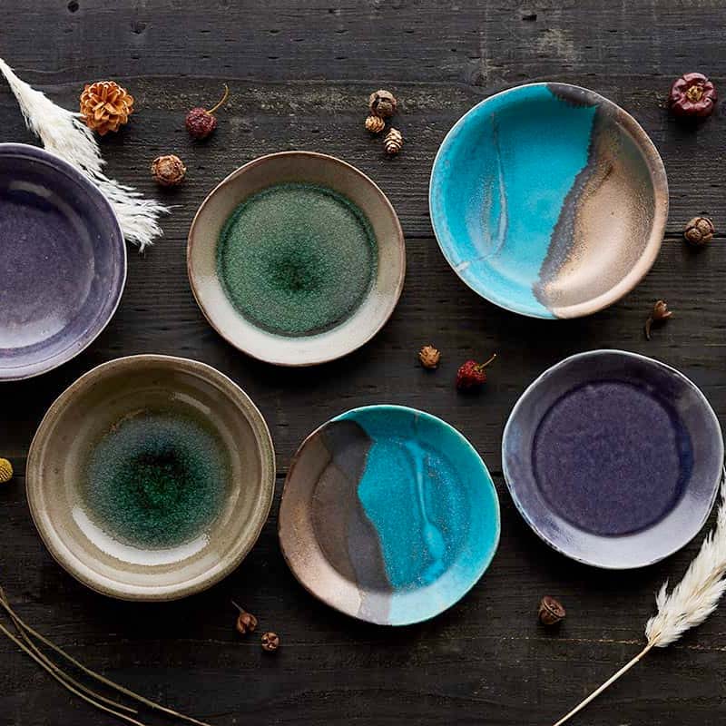 クラフト感を際立てるため、全体のシルエットやエッジの立ち方も、あえて少し歪ませて成形。ベースとなる瑠璃色のガラス系釉薬を内側と外側に掛け分け、複数の顔料を溶け合わせることで、自然なグラデーションを表現した世界にひとつだけの個性溢れる風合いに。